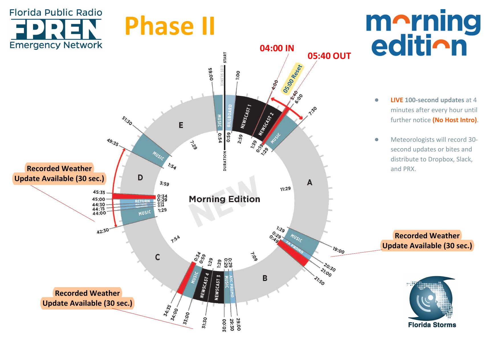 When it becomes likely a tropical system will impact the state, FPREN promptly launches into their Storm Operations workflow. At this time, the team follows designated “Clocks” to broadcast live, hourly weather updates on all public radio stations impacted across Florida. Live radio coverage will continue for the duration of the event or until this level of coverage is no longer deemed necessary.